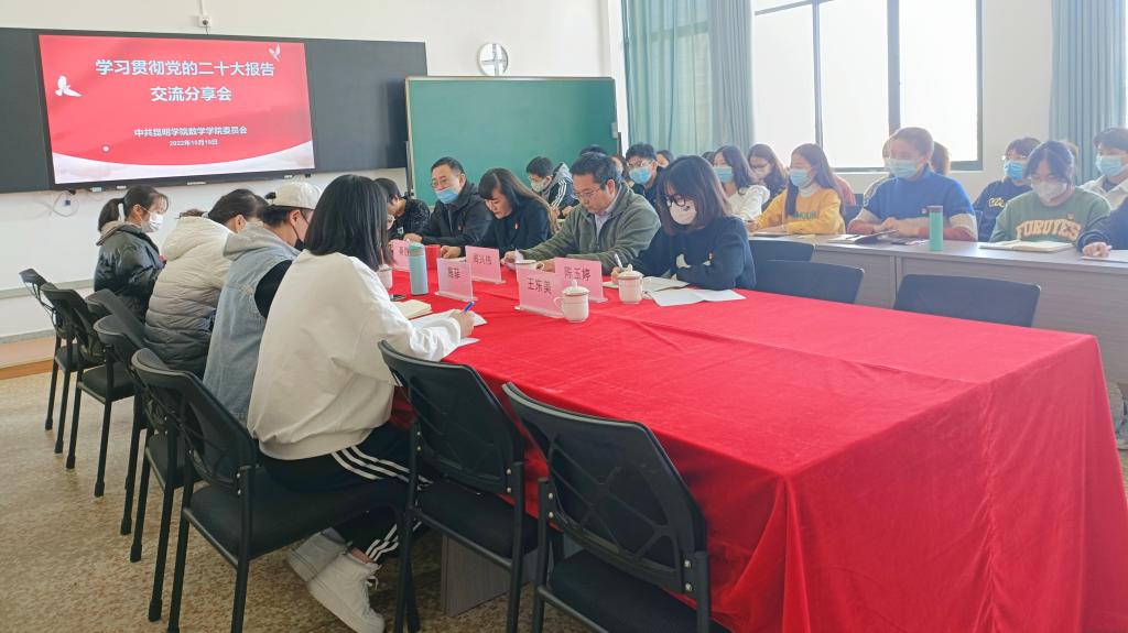 10月19日,数学学院组织召开学习贯彻党的二十大报告交流分享会,党政领导、师生党员、学生干部及学生代表40余人参加交流分享会,数学学院党委书记秦丽娟主持会议。数学学院党委副书记、院长周兴伟及党委委员,党政办主任、学生二支部书记周宇,学生党员代表分别作交流分享发言。