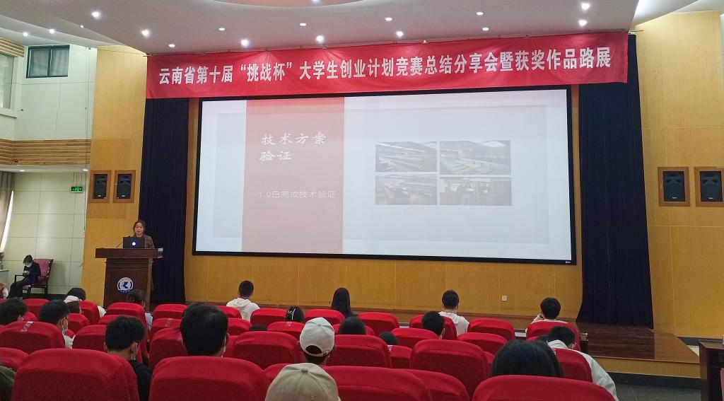 总结分享会上,校团委副书记沈嘉介绍了学校在云南省第十届“挑战杯”·动感地带大学生创业计划竞赛获奖情况,希望同学们以竞赛为契机,学习贯彻党的二十大精神,成为勇于创新的新时代青年。学校参加云南省第十届“挑战杯”大学生创业计划竞赛的《小胡蜂有大作为》《柔性光伏智能充电设备-电动汽车出行必备神器》《虚拟博物仿真视界-元宇宙教育探索者》等九个优秀获奖团队代表分享了比赛历程、参赛经验并与同学们互动交流。