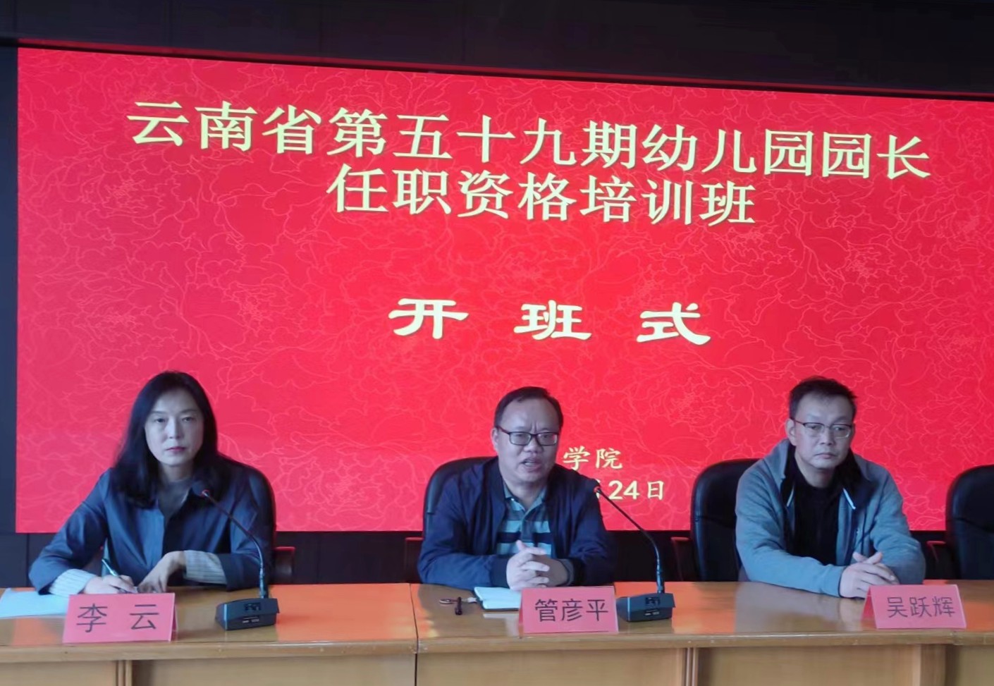 为进一步提高幼儿园园长的政治、业务素质和管理能力,推进我省幼儿园园长队伍建设。10月24日,云南省第五十九期幼儿园园长任职资格培训班在腾讯会议平台如期举办。学校继续教育学院院长管彦平、副院长吴跃辉、培训部主任李云、培训班管理老师温浩参加了开班仪式,仪式由李云主任主持。