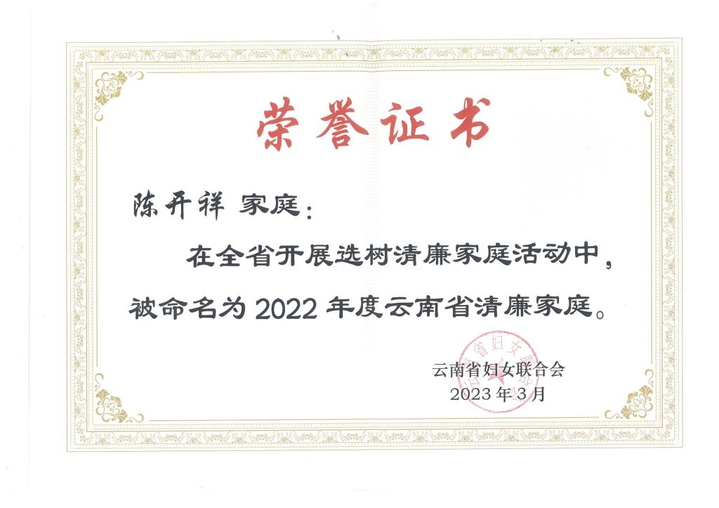 近日,云南省妇联开展的2022年云南省清廉家庭选树活动结果揭晓,德赢官网陈开祥家庭荣获云南省“清廉家庭”称号。