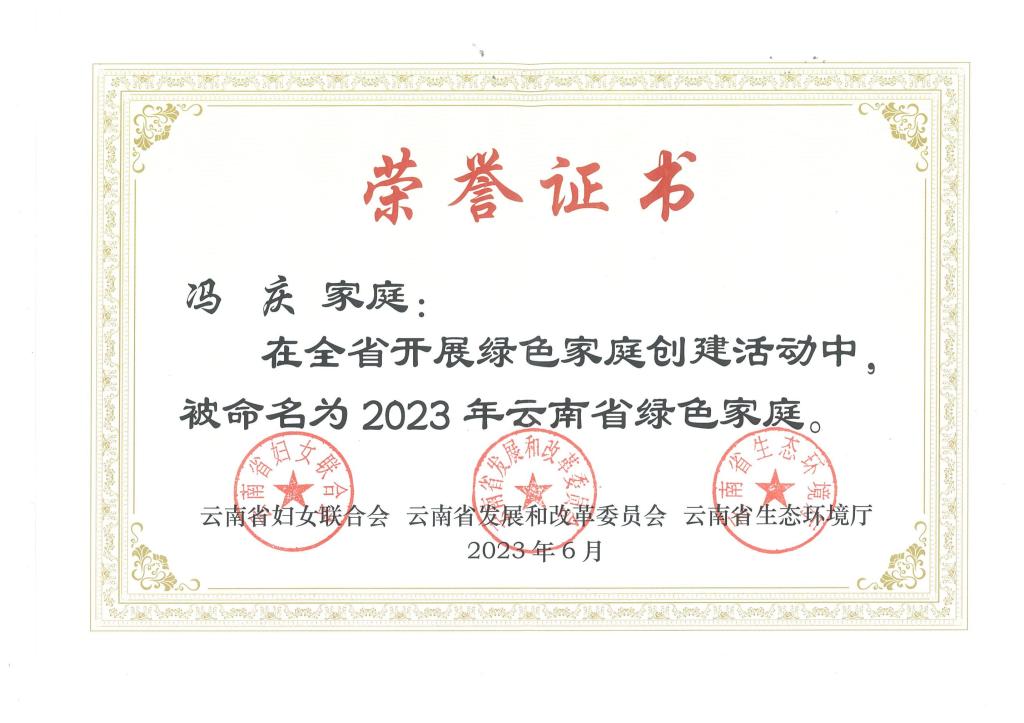 近日,云南省妇联、省发展改革委、省生态环境厅联合开展的2023年云南省绿色家庭创建示范活动结果揭晓,德赢官网教师冯庆家庭荣获云南省“绿色家庭”称号。