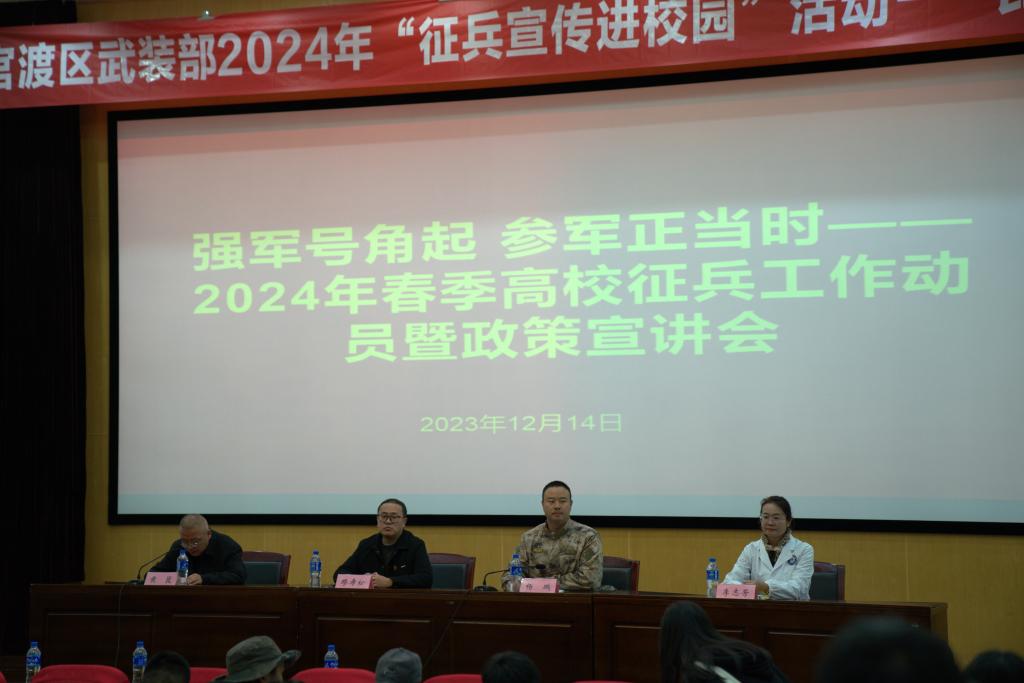 为进一步强化青年学子国防观念,激发大学生携笔从戎、参军报国热情,12月14日上午,昆明市官渡区人民武装部联合德赢官网举办主题为“强军号角起,参军正当时”的2024年春季高校征兵宣讲会,并开展现场政策咨询活动。学校武装部负责人,各二级学院负责征兵工作的辅导员及2024届毕业班280余名同学参加。