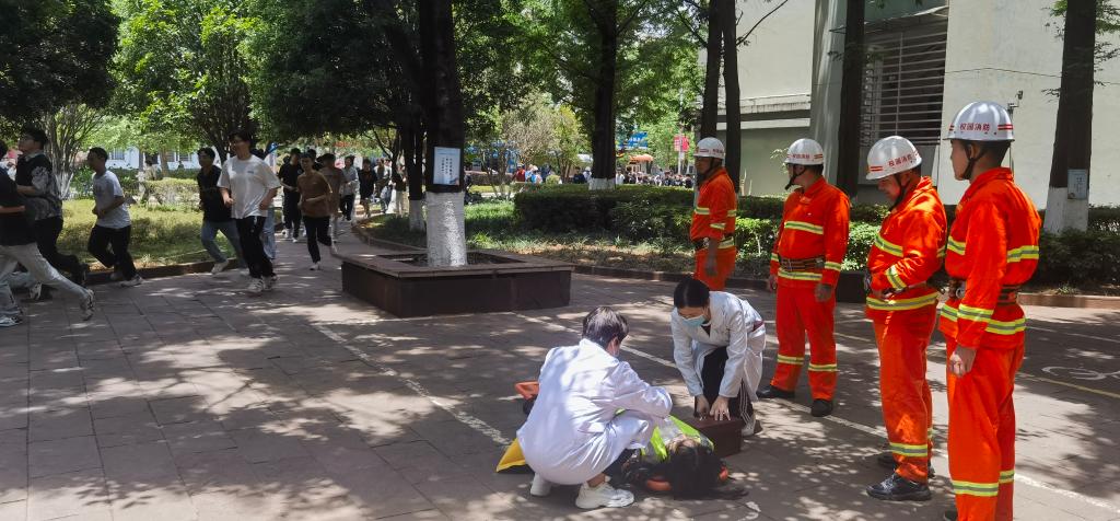 党委委员、副校长沈凡担任演练总指挥,学生处、保卫处、后勤集团宿管中心、校医院、德赢VWIN官方网站义务消防队、云南中和保安服务有限公司驻校大队、云南中铄工程消防维保公司驻校人员及各二级学院1400余名师生参加。