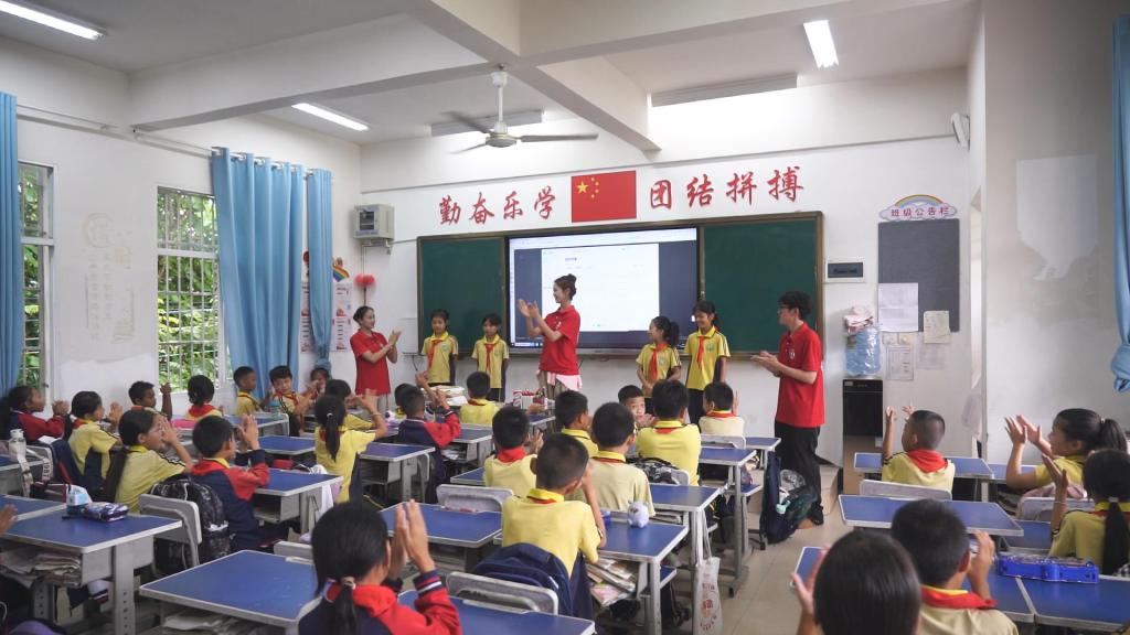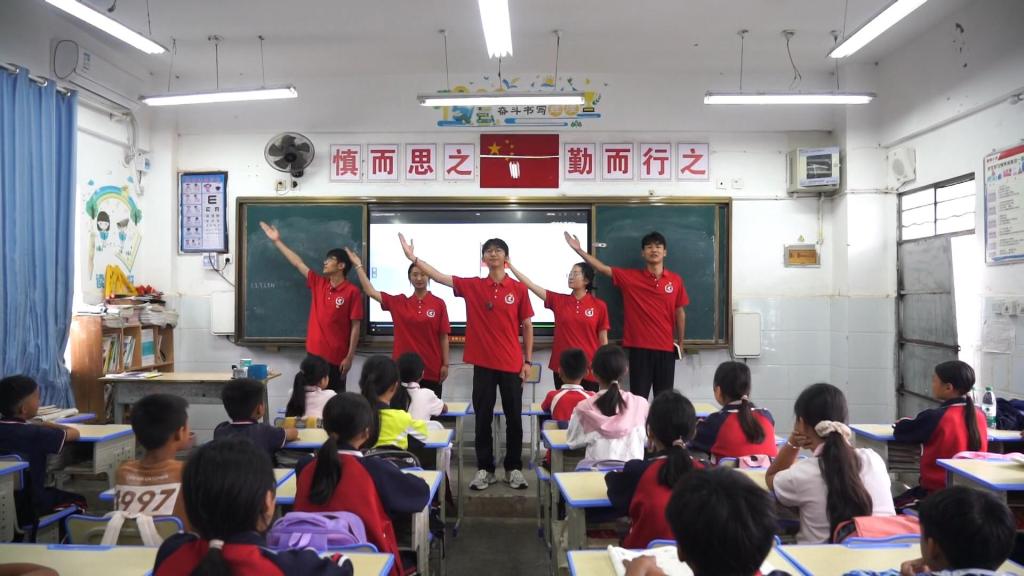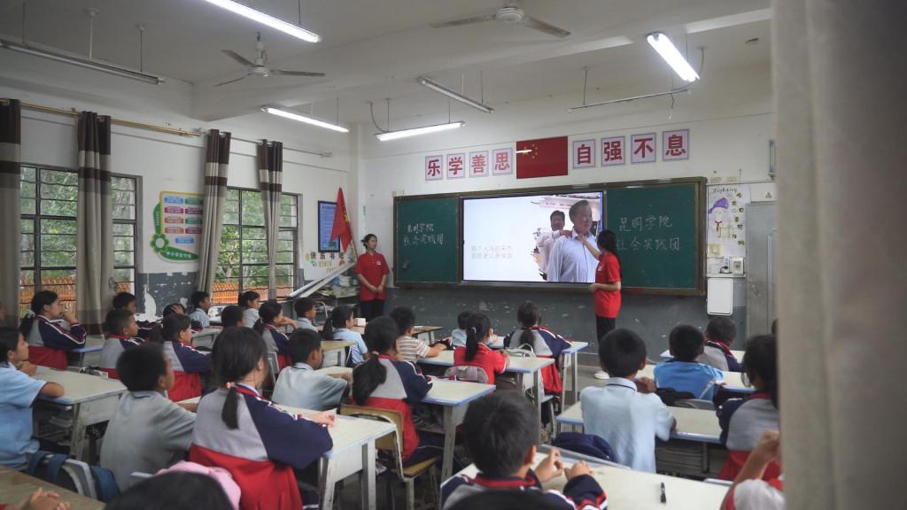 五年级的教室内,实践团成员以聂耳创作国歌的心路历程为线索,通过话剧和朗诵相结合的形式,带领小观众们穿越时空,了解国歌背后的历史和文化,感受聂耳的坚定信仰与爱国情怀,聆听聂耳与国歌的动人故事。通过宣讲一代代云南青年接续奋斗,把青春融入党和人民事业,投身救亡图存、脱贫攻坚、乡村振兴的动人故事,传递了爱国主义的强大力量。“请党放心,强国有我”的口号在教室久久回荡,宣讲课堂用丰富的内容,引导同学们深入体悟中华民族的伟大历史和团结精神,激发爱国情怀和社会责任感。