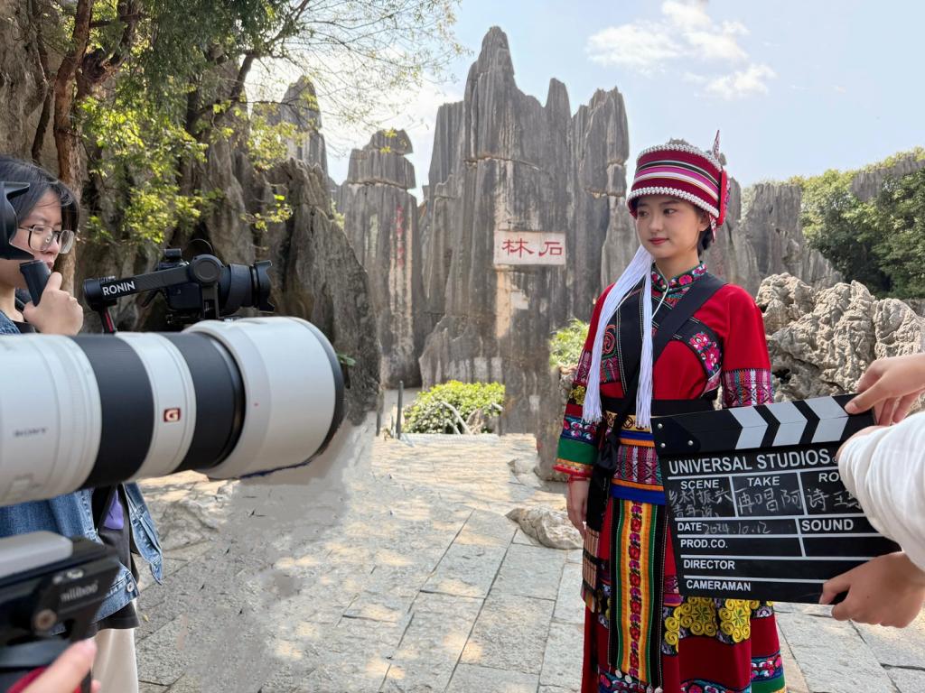 近日,人文学院师生在石林县委宣传部实习基地的协助下,成功完成了《云南乡村振兴青年说》系列纪录片的收官之作——《再唱阿诗玛》。此次拍摄活动由孙雪莹、史东弘、石静、何姣四位老师带队,于10月12日至13日深入石林县进行实地拍摄。