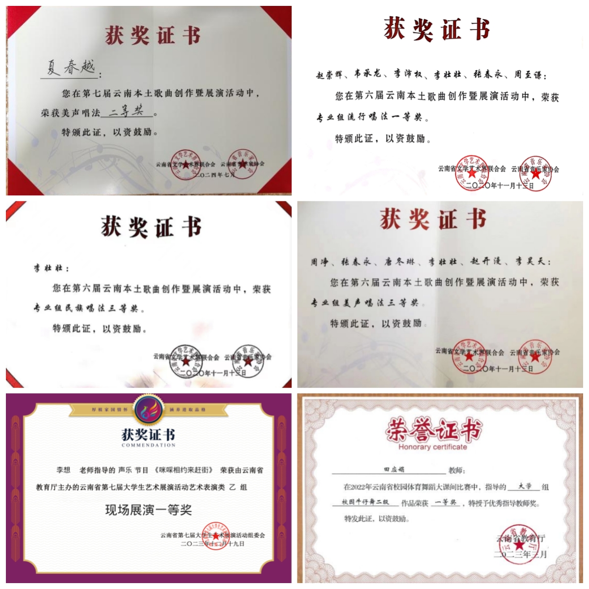 学院先后被授予云南省学生体育协会体育舞蹈专业委员会负责单位、云南省体育舞蹈专业高考统考点、中国大学生体育协会体育舞蹈分会主席单位、云南省民族团结教育基地、全国民族团结进步模范集体等荣誉称号。2018年中央财政支持地方高校项目“云南跨境少数民族歌舞乐数字化保护与传承基地”获批立项;2021年与文旅部文化艺术发展中心共建“云南美育素质教育研究院”。