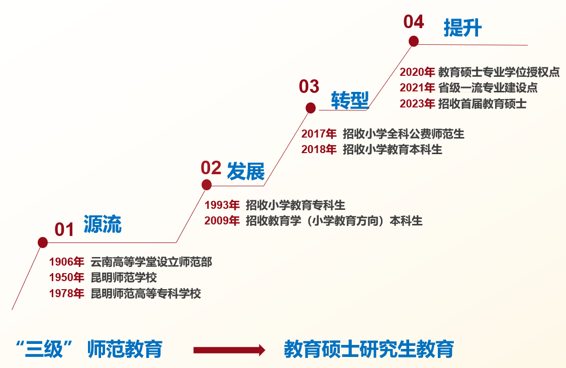 教师教育学院现有小学教育、教育技术学两个本科专业和一个教育硕士专业学位点。其中,小学教育专业办学历史可追溯到1906年的云南高等学堂师范部,之后历经云南省立第一师范学校、昆明师范学校、昆明师范高等专科学校等时期,至今已有百余年办学历史。昆明师范学校时期属中等师范阶段,主要培养小学各科教师(普师、艺师、体师、民师等);昆明师范高等专科学校时期为大学专科教育阶段,1993年招收三二分段小教专科,1998年招收初等教育专科;德赢VWIN官方网站成立后,2009年教育学本科专业招生(小学语文、小学数学、心理健康教育方向,2017年开始招收云南省小学全科公费师范生)。2018年小学教育本科专业招生(继续招收云南省小学全科公费师范生),2020年、2021年先后获批教育硕士专业学位授权点和国家“双万计划”省级一流专业建设点,2023年开始招收首届教育硕士(小学教育)专业学位研究生。