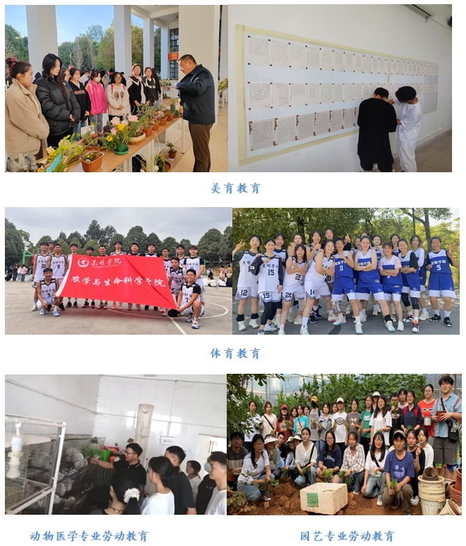 学院自办学以来始终坚持德智体美劳“五育”融合,促进学生全面而有个性地发展。结合实际,学院制定出“五育”综合素质测评管理办法,将劳动教育融入学生实习实训全过程,实现学生的全面发展。例如,实训基地管理委员会组织学生参加生产劳动,动物医学专业学生参与养殖场动物的免疫接种、圈舍卫生清扫等;园艺专业学生进行蔬菜地杂草清除、耕犁实践等;植物保护专业学生参与园区景观提升的劳动、蔬菜的直播、育苗等。学生在劳动中不仅能感受到喜悦和成就感,也增强了专业实践和创新创业能力。