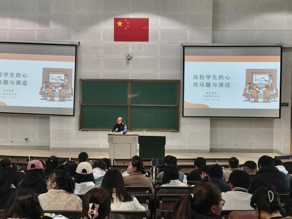 12月20日下午,物理科学与技术学院举办心理健康教育讲座,云南师范大学陶云教授受邀为全体研究生和2022级本科生作专题讲授。物理科学与技术学院院长唐云勇、副院长向友林、研究生秘书杨勇老师以及学校心理健康教育与咨询中心的王荔教授和蒋顺一博士聆听了本次活动。