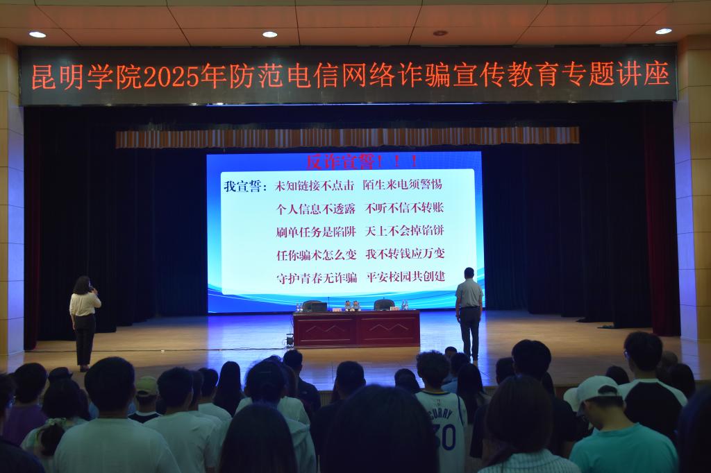 5月16日下午,德赢VWIN官方网站2025年防范电信网络诈骗宣传教育系列活动在学生会堂举行。学校党委委员、副校长彭志远,昆明市公安局经开公安分局、昌宏路派出所相关负责人,学生处、保卫处负责人及公安和学校相关同志与1000余名师生共同参与活动。本次活动由保卫处和学生处主办,经开公安分局及昌宏路派出所协办。
