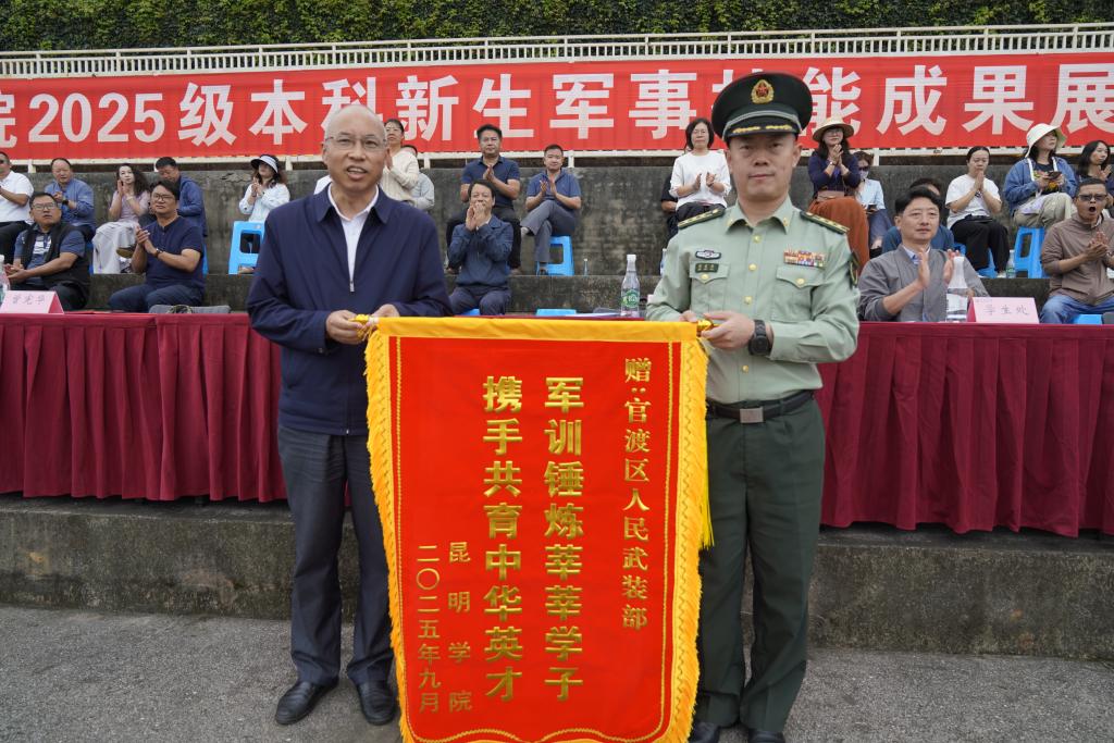 罗荣辉代表学校向承训单位赠送锦旗,对教官们的专业指导与辛勤付出致以诚挚谢意。