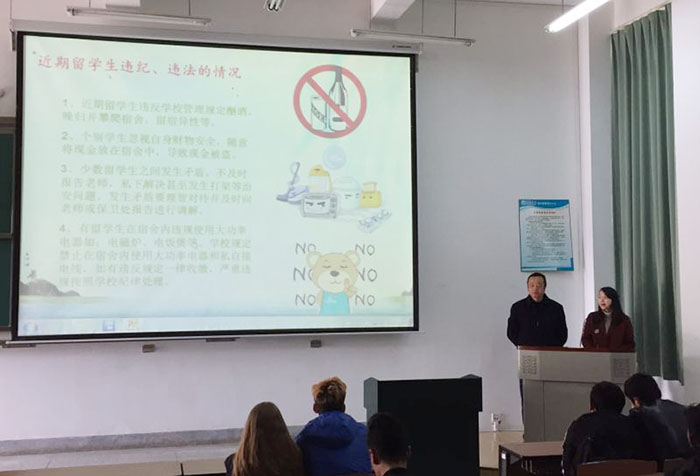 国际学院蔡琳老师与王进老师宣读了对近期违反校纪校规的留学生处分结果,警示所有留学生一定要时刻谨记安全第一、平安留学、学为己任。