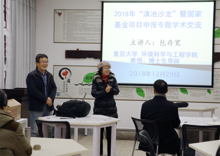 12月29日上午,由昆明滇池(湖泊)污染防治合作研究中心举办的2018年冬季“滇池沙龙”暨国家基金项目申报辅导会在博文楼2104“滇池流域花文化展示与体验分馆”顺利举行。 会议邀请了复旦大学环境科学与工程系教授、博导,国家社科基金重大研究专项首席专家包存宽就“生态文明教育和课程思政”主题,作专题学术指导交流。