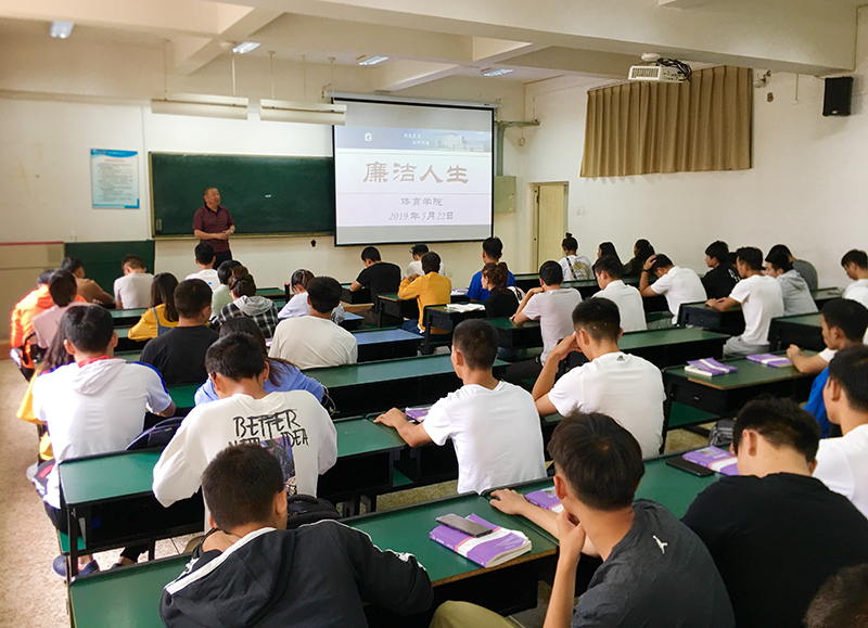 5月22日,体育学院在博识楼召开了毕业生工作大会,并由副院长叶燎昆教授进行了“走出校门最后一堂课——廉洁人生课”教育讲座。