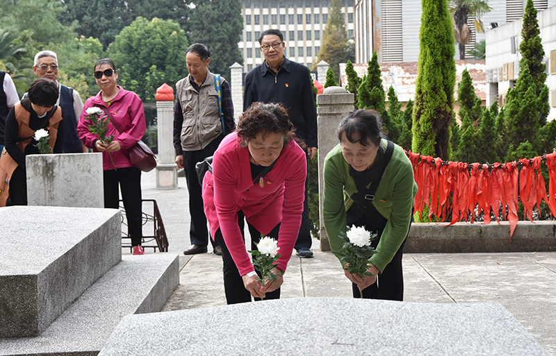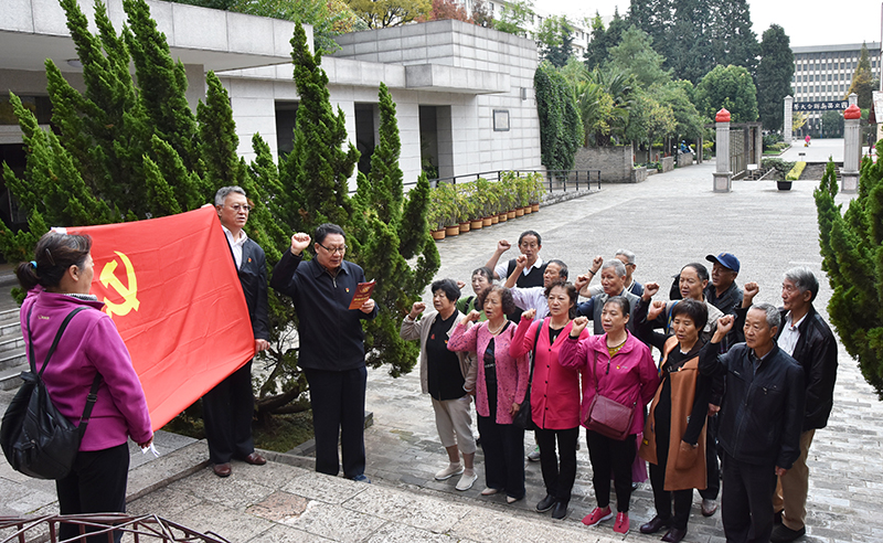 离退休党员们移步“12·1”烈士墓暨闻一多先生墓,手执白菊,向英烈们敬献鲜花、默哀鞠躬。在烈士墓前,展开鲜红的党旗庄严宣誓,不忘初心、牢记使命。