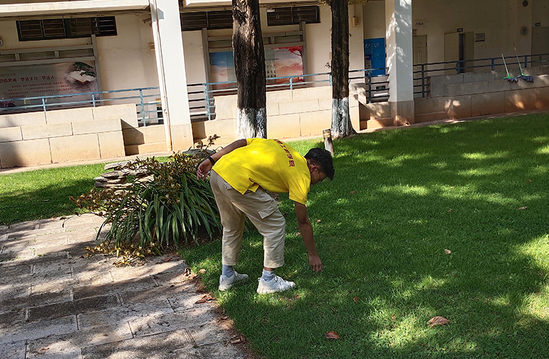 根据活动责任包保片区划分,志愿者们在聂耳广场、惟实楼3栋、4栋进行垃圾清理和卫生清扫,大家分工明确,热情饱满,耐心地刷洗楼梯扶手上的灰尘,清理草坪及道路旁的垃圾。