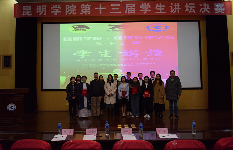 12月12日晚,由共青团德赢VWIN官方网站委员会、经济管理学院主办,经济管理学院团总支学生会承办的德赢VWIN官方网站第十三届学生讲坛决赛在惟行楼1501报告厅成功举办。共青团云南省委副书记(挂职)、共青团德赢VWIN官方网站委员会书记魏妮娅老师,共青团云南省委副书记(挂职)、云南广播电视台著名主持人周怀君老师,共青团德赢VWIN官方网站委员会副书记沈嘉老师担任评委。德赢VWIN官方网站校团委副书记郎易老师、经济管理学院团总支书记鲍鲲老师和200余名学生观看比赛。