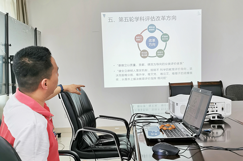 马宏老师结合自己到国家学位中心学习工作经验和参加第五轮学科评估培训会情况,以第四轮学科评估为个案,为支部党员系统讲解学科评估基本情况、评估背景、指导思想和指标体系,并重点介绍了第五轮学科评估改革方向、要求和思考。并同与会党员围绕德赢官网学科评估问题展开讨论,对相关问题作了进一步深入解答。