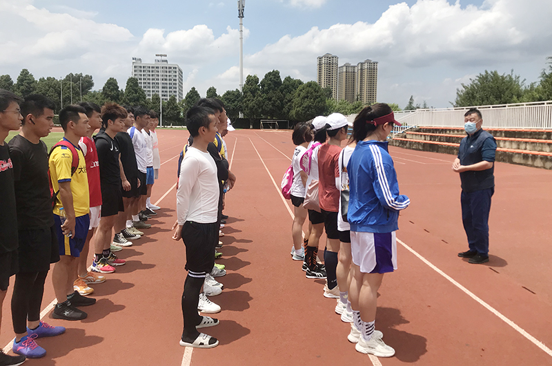 6月19日,体育学院2020年“枫叶杯”五人制足球赛在洋浦校区运动场举行,院长叶燎昆主持开幕式并为比赛开球。