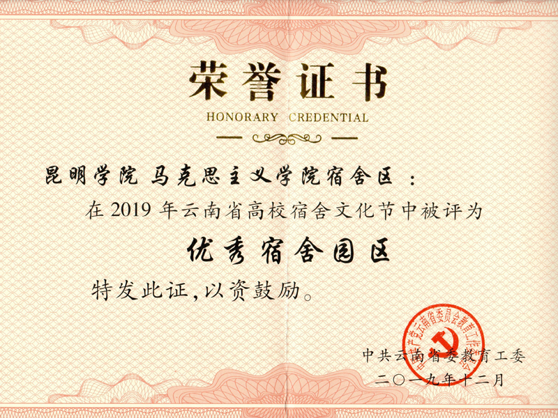 为推进高校宿舍文明建设,营造良好的育人环境,马克思主义学院以“绽放魅力,创马院特色之家”为主题,积极开展宿舍文化创建活动,取得了良好效果,被省教育工委评为“2019年云南省高校宿舍文化节优秀宿舍园区”荣誉称号。