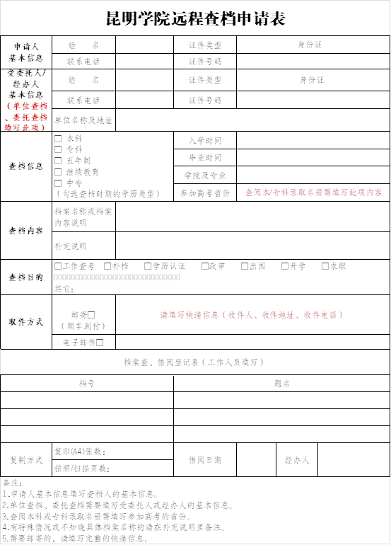 有查档需求的部门和个人,请先填写《德赢VWIN官方网站档案馆远程查档申请表》(下载w6.kmu.edu.cn/info/1190/1393.htm),并发送相关证明材料至邮箱kmudag@kmu.edu.cn,工作人员审核通过后依次办理,具体要求如下: