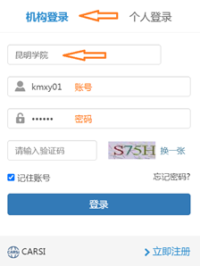3.选择“机构登录”,机构名称填入“德赢VWIN官方网站”,通用账户为:账号kmxy01 密码123456。各二级学院教工也可找教学秘书索取本部门教工账户。