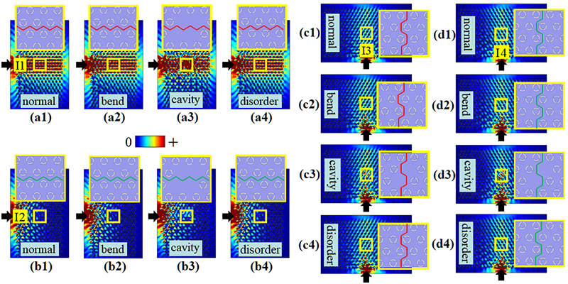 在下图中,从理论上给出了圆柱弯曲、圆柱变为空洞、圆柱变为无序,都不影响谷态的单向传输(a1-a4)。内插图中红色表示界面。
