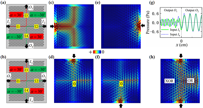 图4 谷界面态声波分束和聚合和逻辑门功能