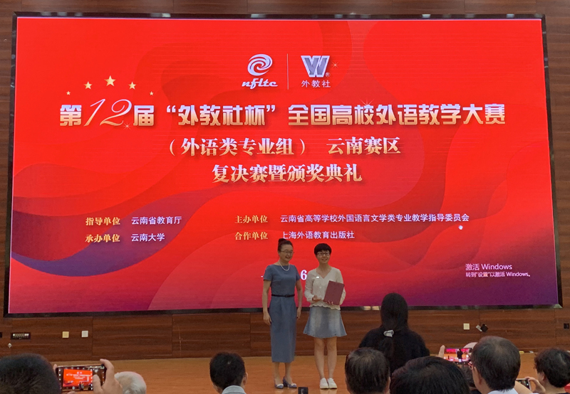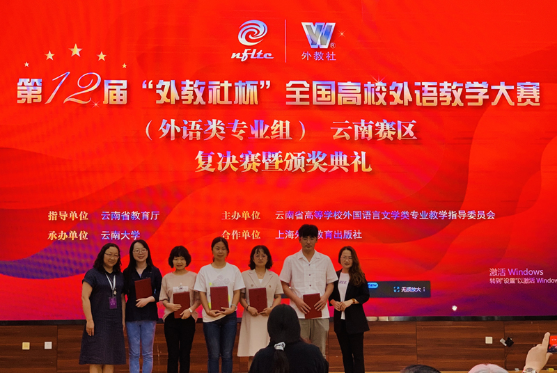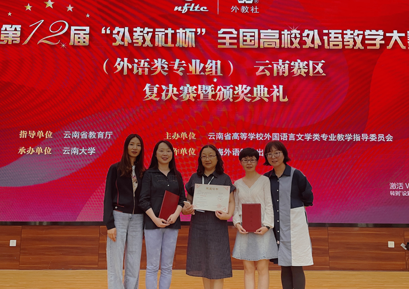 6月5-6日,外国语学院教师在第十二届“外教社杯”全国高校外语教学(英语专业组)大赛云南赛区复赛中表现出色,赵瑾老师荣获英语专业组特等奖,将代表云南省参加全国总决赛;周蕾老师荣获商务英语组三等奖;德赢VWIN官方网站荣获“优秀组织奖”。