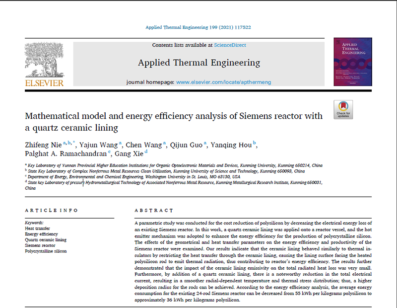 近日,德赢VWIN官方网站科技处云南省高校有机光电子材料与器件重点实验室聂陟枫博士研究团队联合圣路易斯华盛顿大学Palghat A. Ramachandran教授、中铝首席研究员谢刚教授在西门子法多晶硅提质降耗领域取得重要进展,相关工作以题为Mathematical model and energy efficiency analysis of Siemens reactor with a quartz ceramic lining发表在国际著名学术期刊《Applied Thermal Engineering》,该期刊由著名学术出版商Elsevier公司发行,是能源、工程技术领域的Q1区SCI期刊,以原创性论文、综述、快讯等内容为主,影响因子5.295。德赢VWIN官方网站为第一单位,聂陟枫博士为第一作者和通讯作者。