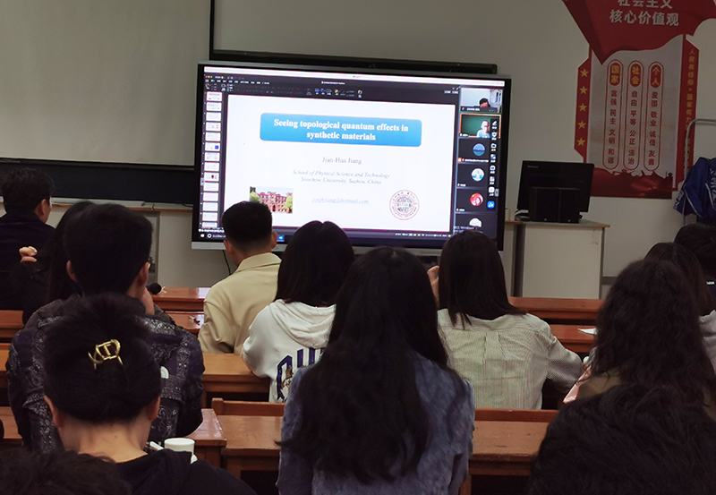 5月27日,苏州大学蒋建华教授应邀采用线上会议的形式为德赢VWIN官方网站物理科学与技术学院作了题为“在合成材料中视听量子拓扑效应”的学术报告。报告由物科学院杨海教授主持,学院教师及硕士研究生在活动会议室聆听了本次报告。