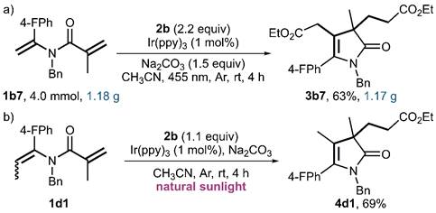 近日,德赢官网化学化工学院本科生胡筱、陶明林、马忠校在梁德强教授(德赢VWIN官方网站领军人才)指导下,在光催化杂环合成取得阶段性成果,报道了可见光诱导的3-氮杂-1,5-二烯区域选择性串联烯酰胺β-C(sp2)−H烷基化/丙烯酰胺烷基化/烯基化环化反应序列,该反应从易得的N-烯基丙烯酰胺出发,呈现高度的区域选择性,且效率高、底物范围广,为3,4-双烷基化的4-吡咯啉-2-酮合成提供了便捷方法。该反应可以轻松放大到克级规模,且可以使用自然太阳光作为光源。研究成果以题为“Regioselective Photocatalytic Dialkylation/Cyclization Sequence of 3-Aza-1,5-dienes: Access to 3,4-Dialkylated 4-Pyrrolin-2-ones(光催化3-氮杂-1,5-二烯区域选择性双烷基化/环化序列合成3,4-双烷基化-4-吡咯啉-2-酮)”的论文发表在国际有机化学权威期刊《Advanced Synthesis & Catalysis》上。