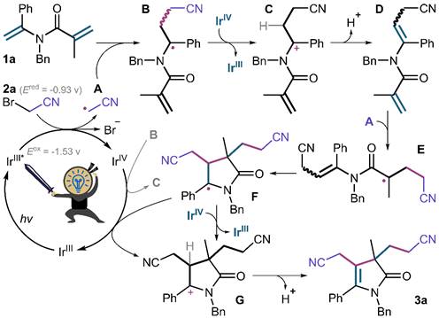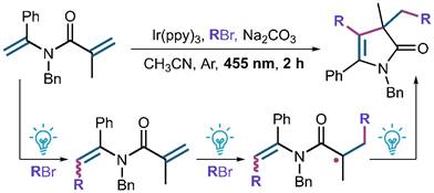 4-吡咯啉-2-酮衍生物通常具有显著的生物活性,其母核结构存在于大量生物碱分子中,如cyanogramide,violacein,diaporthalasin,sagassumlactam,cespitulactam K,denigrin D和At-2HM-iso-DNCC-431等。然而,4-吡咯啉-2-酮的构筑方法却很少,且需要激烈的反应条件和昂贵或有毒的过渡金属催化剂。自由基环合反应和烯烃双官能团化反应都是快速构建复杂分子的强力手段。其中,自由基环合反应为了实现环化,需要有内置的自由基捕获基团,而该基团当前基本局限于芳基、炔基、氰基和羰基,因此对应的环合产物类型被很大程度限制。另一方面,几乎所有类型的烯烃对自由基都具有高度反应活性,可以预想1,5-二烯的自由基环合反应极具挑战,可能存在严重的区域选择性问题。