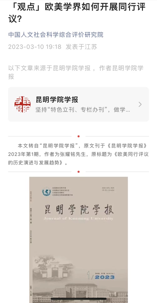 3月11日,刊发于《德赢VWIN官方网站学报》2023年第1期,由《新华文摘》原总编张耀铭撰写的《欧美同行评议的历史演进与发展趋势》一文,经《德赢VWIN官方网站学报》微信公众号推送后,被“中国人文社会科学综合评价研究院”微信公众号全文转载。