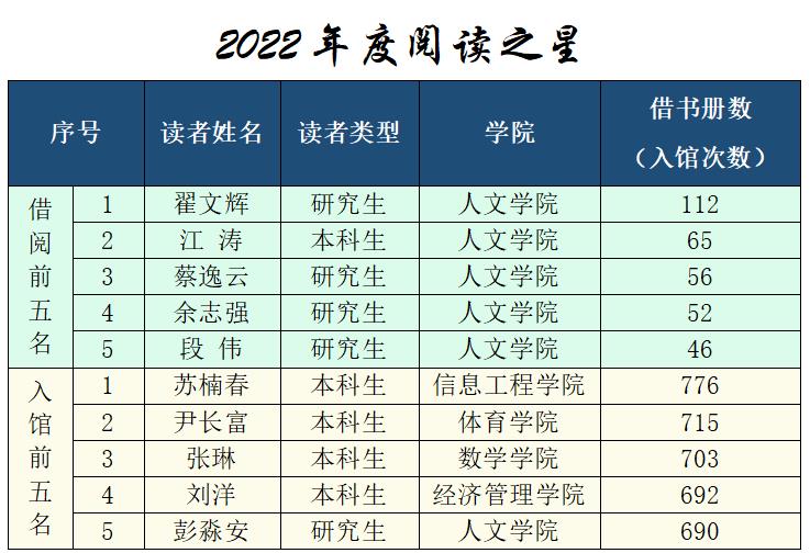 最是书香能致远,腹有诗书气自华。近日,在德赢VWIN官方网站2022年世界读书日系列活动之年度“阅读之星”评选活动中,根据图书馆2022全年图书借阅和入馆次数排行,人文学院翟文辉等5名研究生和人文学院江涛等5名本科生获评为 “阅读之星”。