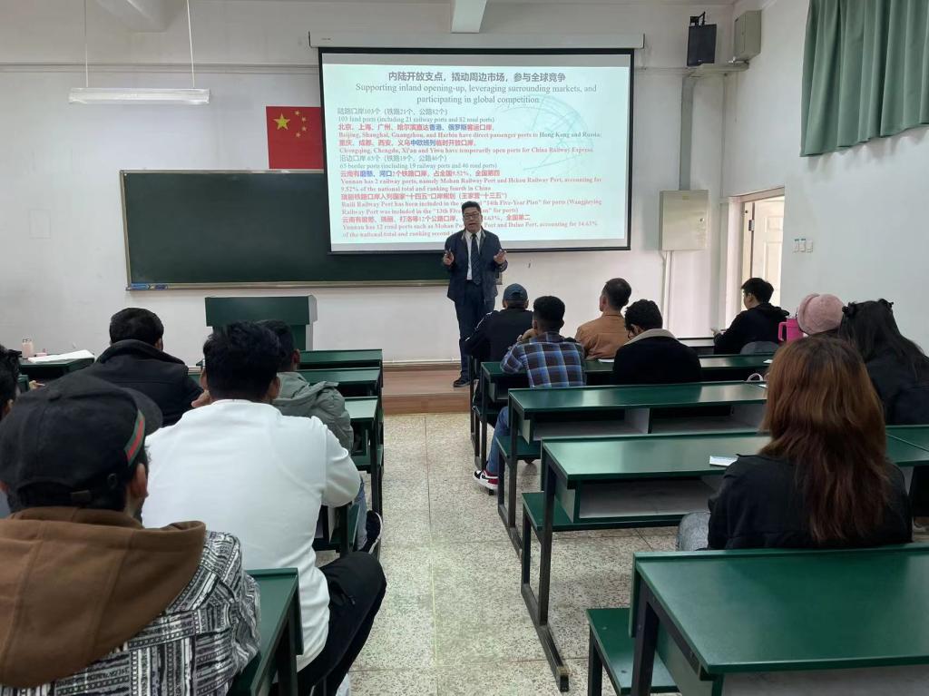 董佳介绍了自贸区昆明片区的具体情况,从口岸的建设、自贸区的作用、昆明片区制度创新等方面为留学生作了创新创业教育,并现场解答了留学生们提出的问题。