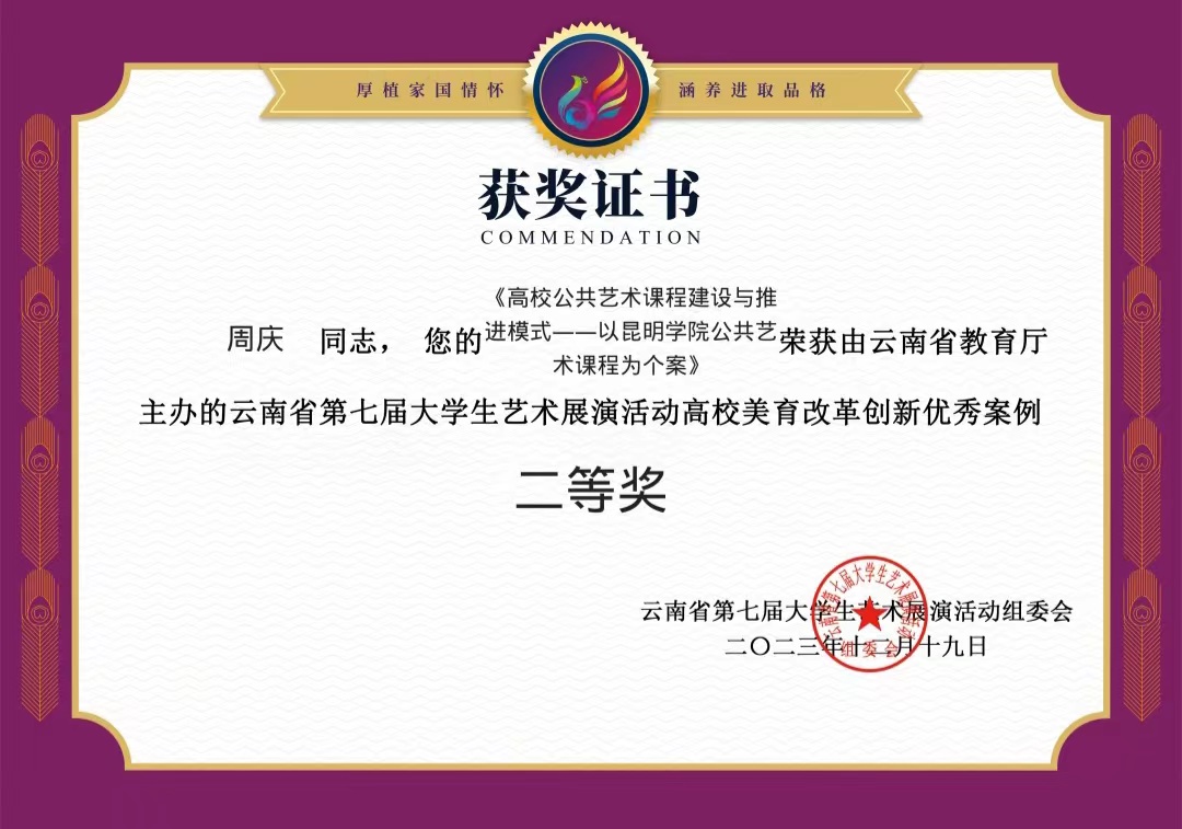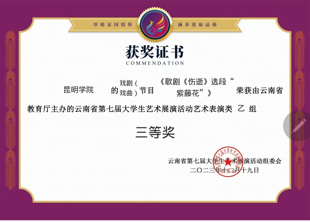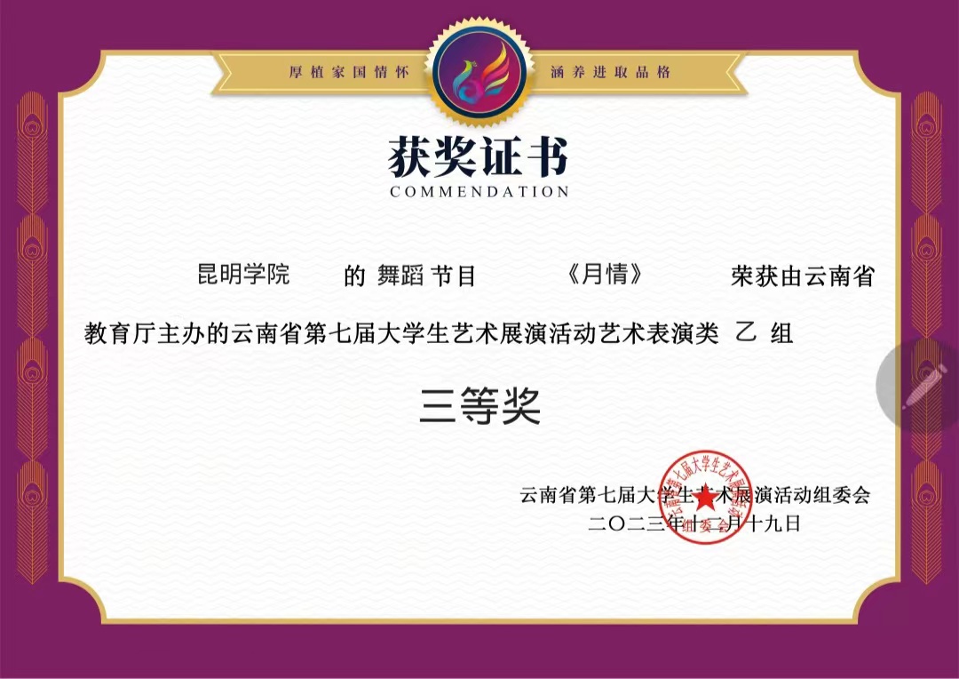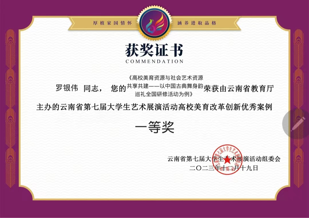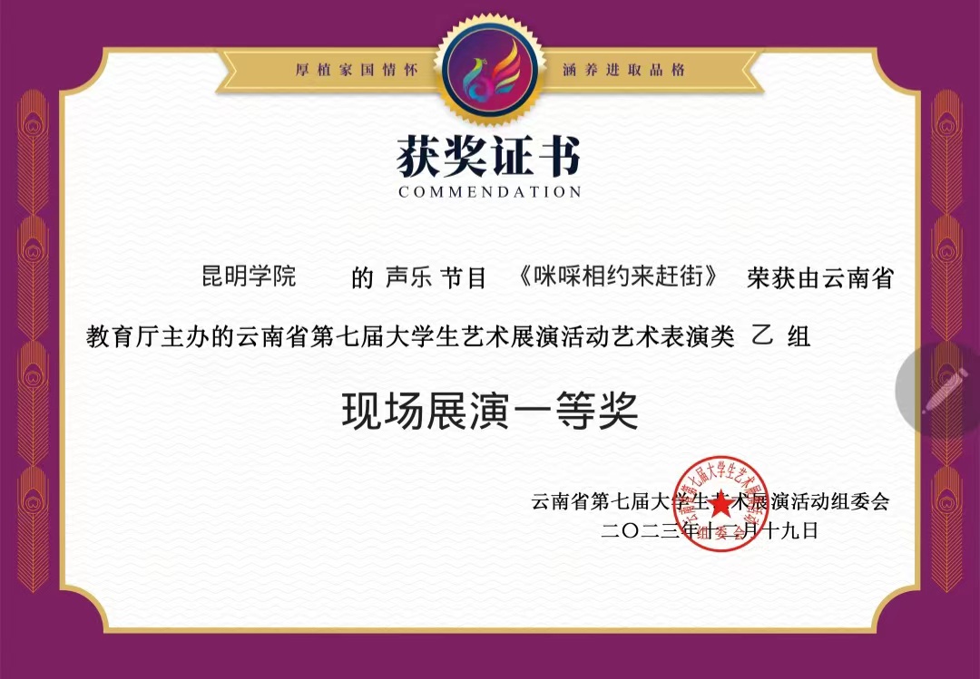 音乐舞蹈学院围绕云南省第七届大学生艺术展演主题“厚植家国情怀,涵养进取品格”,组织师生积极准备,经过评选,最终取得了2个一等奖、2个二等奖、3个三等奖和1个优秀奖的好成绩。
