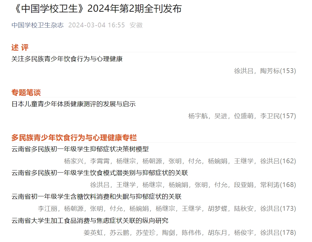 近日,德赢VWIN官方网站医学院社区护理研究团队在北大核心期刊《中国学校卫生》上发表了五篇关于多民族青少年饮食行为与心理健康的论文,其中四篇为论著,一篇为述评。团队负责人徐洪吕博士受邀组稿本期重点号“多民族青少年饮食行为与心理健康”专栏并撰写述评,其余四篇论文由徐洪吕、杨家兴、李江丽和姜英虹四位老师分别作为第一作者发表。