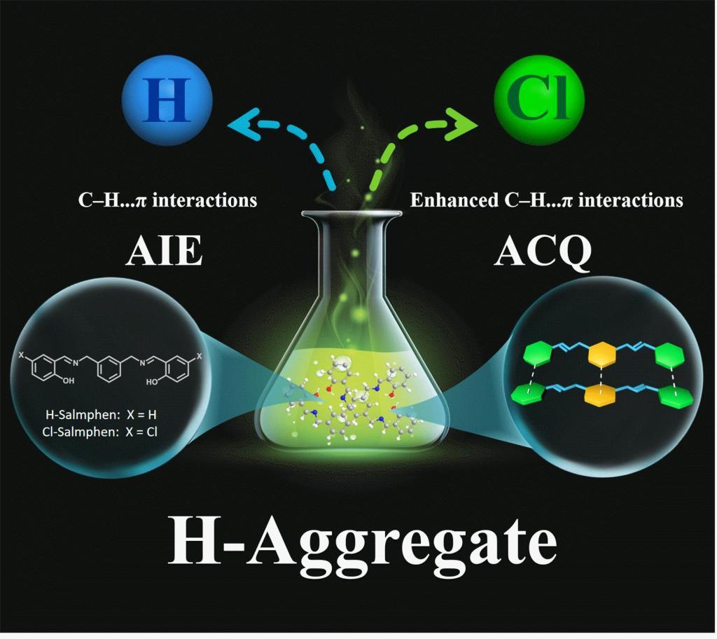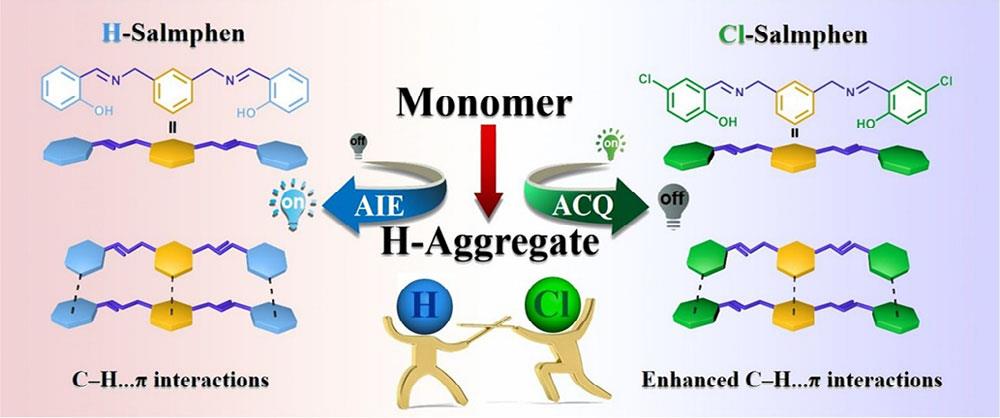 在最近的研究中,德赢VWIN官方网站吴琼教授团队,成功合成了两种具有H-聚集特性的席夫碱化合物Cl-Salmphen和H-Salmphen。单晶结构分析表明,两个光谱学呈H-聚集体特征的分子之间并不存在π-π相互作用;相反,相邻分子之间主要通过C-H...π相互作用连接。这意味着C-H...π相互作用也可以诱导H-聚集体的产生。更有趣的是,尽管卤素原子的引入并没有改变分子间的相互作用类型和堆积模式,但其荧光行为发生了从聚集诱导荧光增强(AIE)到聚集荧光猝灭(ACQ)的转变根本转变,理论计算表明这与卤原子的引入增强了分子间相互作用有关(图1)。性质研究表明,这种独特的相互作用模式在形成了超高光学信噪比的同时还有效的拓展了探针在有机物中水含量检测范围。此外团队利用这一特点,制作了一个高效的荧光试纸传感器,并借助手机实现了有机溶剂中含水量的快速、准确的实时检测。这项工作为H-聚集体的形成机制和新型光学器件的拓展提供了一个崭新的视角。