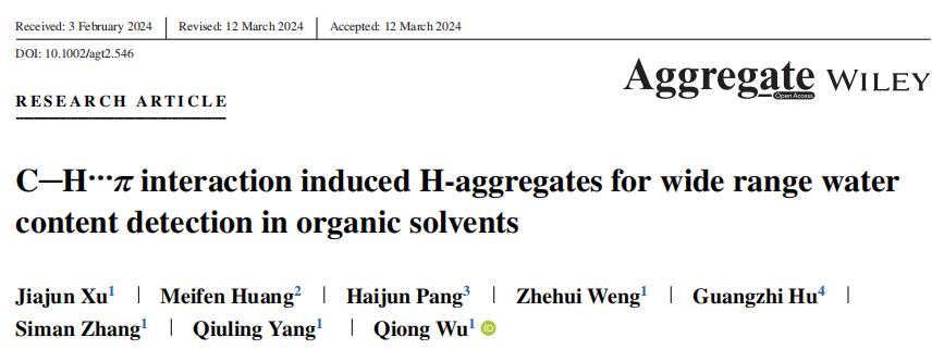 近日,德赢官网化学化工学院吴琼教授团队在光学材料领域取得新进展,相关工作以题为“C-H...π interaction induced H-aggregates for wide range water content detection in organic solvents”的文章发表在顶级期刊《Aggregate》(doi.org/10.1002/agt2.546)上(中科院一区,影响因子: 18.8),实现了德赢官网在国产顶级学术期刊的突破。德赢官网化学化工学院2021级研究生许家俊为第一作者,化学化工学院吴琼教授为通讯作者。