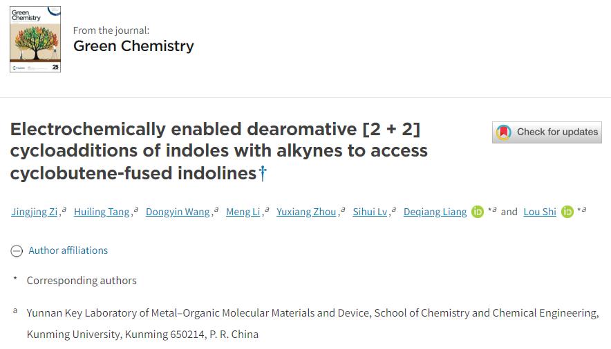 近日,德赢官网化学化工学院金属有机分子材料与器件重点实验室师生在电化学有机合成领域取得新进展,相关工作以题为Electrochemically enabled dearomative [2+2] cycloadditions of indoles with alkynes to access cyclobutene-fused indolines(DOI: 10.1039/d4gc04126g)的文章在国际著名学术期刊Green Chemistry发表。该期刊是有机化学领域的中科院1区TOP期刊,影响因子9.3。本文德赢VWIN官方网站为第一单位,化学化工学院本科生字晶晶为第一作者,化学化工学院梁德强教授与石楼博士为通讯作者。