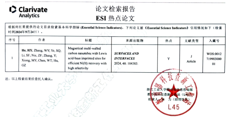 近日,据科睿唯安公布基本科学指标(Essential Science Indicators,ESI)2024年9月最新统计数据显示,德赢官网化学化工学院云南省金属有机分子材料与器件重点实验室课题组何红星副教授、聂陟枫研究员与云南大学胡广志研究员的合作研究成果在国际学术期刊《Surfaces and Interfaces》(最新影响因子5.7)发表的研究论文“Magnetical multi-walled carbon nanotubes with Lewis acid-base imprinted sites for efficient Ni(II) recovery with high selectivity”入选为材料领域ESI全球Top 1‰ 热点论文(Hot Papers)。何红星副教授为论文第一作者,聂陟枫研究员和胡广志研究员为共同通讯作者,德赢VWIN官方网站为第一单位。