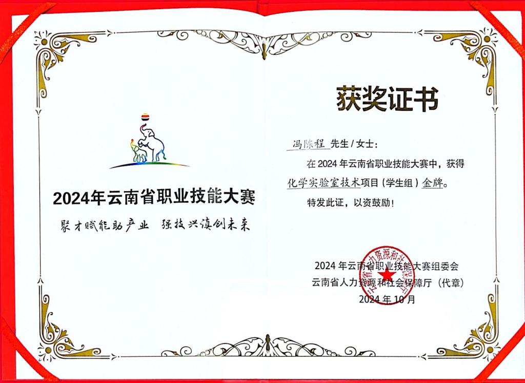 10月15日至17日,由云南省人力资源和社会保障厅、省教育厅、省总工会联合主办的2024年云南省职业技能大赛在昆举行。德赢官网化学化工学院学生冯陈程(指导教师:邓秀君)在“云南省职业技能大赛-化学实验室技术”学生组中以总评分排名第一的优异成绩,获得金奖,将代表云南省参加2025年举行的第三届全国技能大赛。
