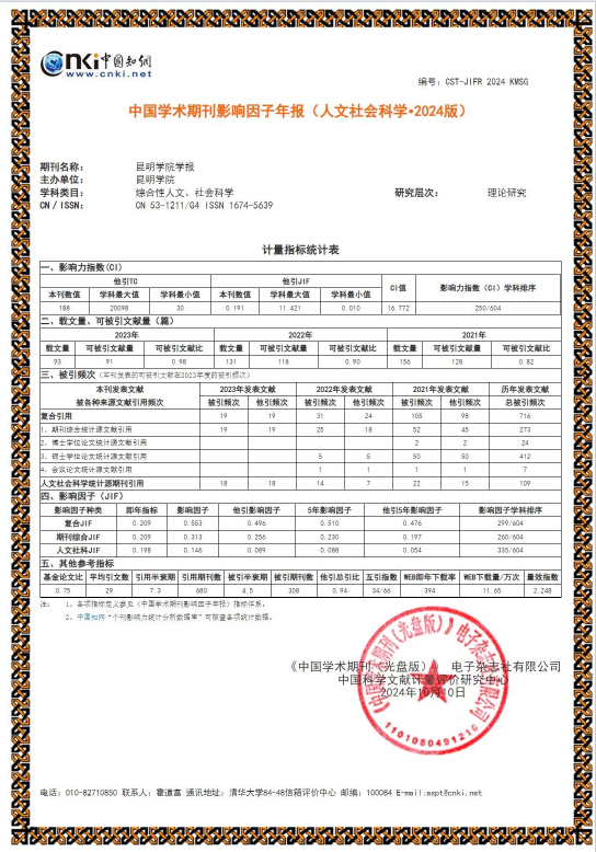 据中国知网最新发布的《中国学术期刊影响因子年报》(人文社会科学•2024版),《德赢VWIN官方网站学报》影响因子数据及全国排位大幅提升:期刊综合影响因子为0.313,比2023年版的0.216提升45%;复合影响因子0.553,比2023年版的0.492提升12.4%;影响力指数在全国社科综合类期刊中排位为250/604,比2023年版的268位提升了18位。影响因子在云南省文理综合刊中排名第一。
