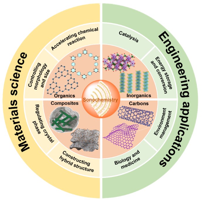 基于前期研究基础,团队对声化学法合成功能材料近几年的研究发展进行了系统的综述,该工作近日以“Sonochemistry: Materials science and engineering applications”为题,在国际知名期刊Coordination Chemistry Reviews (中科院一区,影响因子:20.3)上以综述论文发表,23级硕士研究生王成娇为论文第一作者,王宝玲教授,陶娆博士和杨烨鹏博士为共同通讯作者。在该综述中团队重点介绍了超声空化在材料合成中的化学和物理效应,包括声-压、声-机械、声-热、声-自由基,并系统总结了超声合成功能材料在催化、能源转化、环境治理、生物医学等领域的研究进展。最后,团队对该领域当前面临的挑战和未来发展趋势进行了细致的讨论。