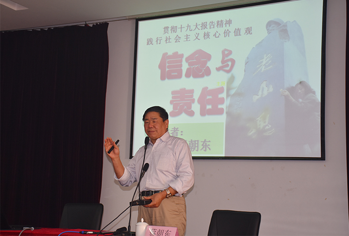 讲座上,蔡朝东老师讲座的内容分为理想、信念、诚信、勤俭、责任五部分,为大家详细区分了理想和信念的概念差异。在理想信念部分,蔡老师声情并茂的讲述了对越自卫反击战中很多不为人知的背景和细节,他 “有国才有家”的家国情怀令在座的很多老师、学生为之动容落泪。最后,蔡朝东老师呼吁大家要践行习近平主席倡导的“人民有信仰,国家有力量,民族有希望”。
