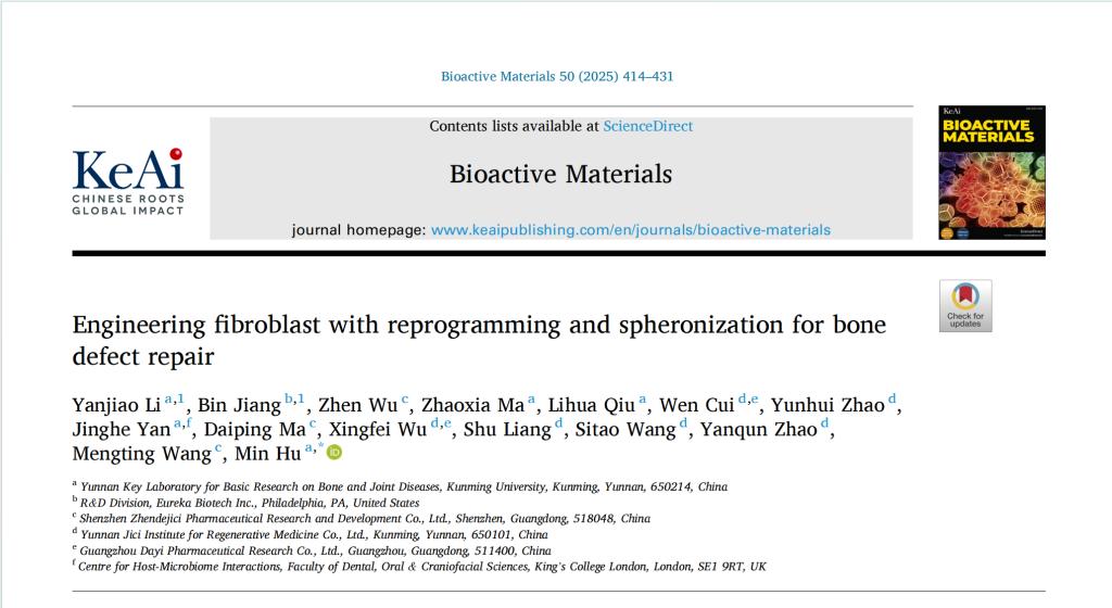 近日,德赢VWIN官方网站云南省骨与关节疾病基础研究重点实验室在国际知名期刊《Bioactive Materials》(中国科学院1区TOP期刊,影响因子:18.0)上发表题为“Engineering fibroblast with reprogramming and spheronization for bone defect repair”的研究论文,引发学界关注。