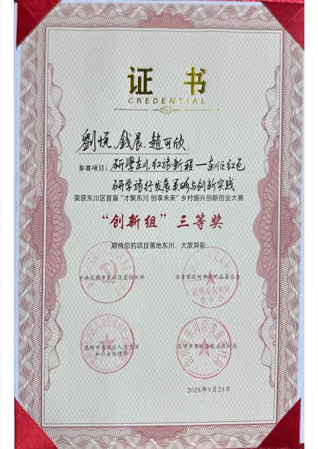本次大赛共有500余名创新创业人员参与,169个涵盖特色农业、文旅融合、智慧乡村等领域的项目进行比拼。德赢官网青年学子刘悦、钱晨、赵可欣团队的“研学东川,红旅新程——东川区红色研学旅行发展策略与创新实践”创新项目脱颖而出,荣获大赛创新组三等奖,获得奖金4000元,并现场与云南博轩文旅签署项目落地意向协议书,享受东川区相关产业扶持政策及大赛提供的28项支持政策,初步实现了“挑战杯”大学生课外学术科技作品竞赛成果的落地转化。