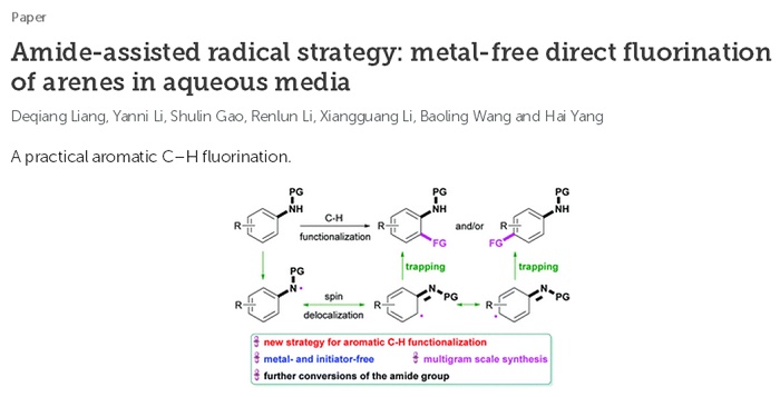 6月20日,化科系师生在国际顶级学术期刊《Green Chemistry(绿色化学)》上发表研究论文,报道了首例芳烃自由基型直接氟代反应。该论文题为Amide-assisted radical strategy: metal-free direct fluorination of arenes in aqueous media(酰胺协助自由基策略:水相中芳烃的无金属直接氟代反应)。它的发表,不仅是德赢官网在中国科学院一区期刊论文方面的突破,而且标志着德赢官网的科学研究在某些领域已达到世界先进水平。