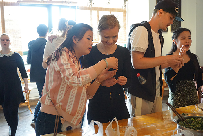 欢迎见面会后,挪威NLA大学师生一行人到德赢官网体育馆、青年活动中心、美艺学院开展了一系列的交流文化活动。外国语学院学生为挪威师生展示了怎样包饺子,并邀请挪威师生体验包饺子的过程。美艺学院的蒋老师向来访客人展示了自己的剪纸作品。双方的同学还就各自的大学生活和英语学习展开了细致地讨论。